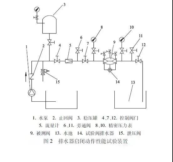 排水器密封性能试验装置与排水器启闭动作性能试验装置一致。试验时,出口有流量流出,调节被测阀,使出口流量从微流量到额定流量(管中平均流速2m/s),再从额定流量减小到微流量。在整机有流量通过时,排水器在整个试验过程中应密封关闭,无可见渗漏。在进口压力小于出口压力时,倒流防止器应能有效的防止回流污染水源。在进口压力小于出口压力时,排水器应能有效开启,使中间腔与大气相通。在止回阀和整机(包含排水器)内动密封件结构应能保证在其密封失效时,所漏介质均应直接流向中间腔或阀外。出水止回阀密封口挂有直径为3.0mm的金属丝时,其最大渗漏流量应符合规定。当渗漏介质流经排水器的流量达到规定时,且中间腔压力不大于10 5KPa时,计量排水器的流出量。耐久性能试验装置如图3所示。整机在连续启闭运行试验2万次后,应保持原有的性能。